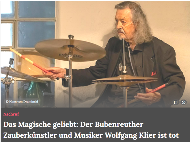 Beim MUSE-Stammtisch war er immer ein gern gesehener Gast: Vor kurzem verstarb Wolfgang Klier, der in der hiesigen Musikszene auch ein recht bekannter Schlagzeuger war, im Alter von 81 Jahren. Er, der im Hauptberuf Abteilungsleiter bei der Firma Saumweber in Erlangen gewesen war, machte jahrzehntelang Tanzmusik in allen bekannten Tanzlokalen der Region, wie beispielsweise als Mitglied der Klaus-Hörmann-Band. Als Zauberer und Mentalmagier bekannt, trat er regelmäßig in der Kleinkunstbühne „fifty fifty“ in der Südlichen Stadtmauerstraße auf. Er war einer der wenigen Deutschen, die Aufnahme im exklusiven Club „British Magic Circle“ fand. Darüber hinaus war er Ritter Merlinostro der Vereinigung Schlaraffia Am Erlenanger, der er mehrere Jahrzehnte angehörte. Nach 20-jähriger Pause vom Schlagzeug nahm Klier vor drei Jahren wieder die Trommel-Sticks in die Hand, um in einer Band zu spielen. Er wird immer unter uns sein. |